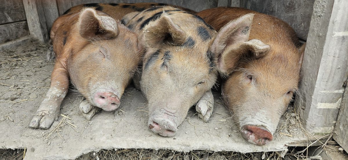 De varkens worden jaarrond buiten gehouden waar ze hun natuurlijke gedrag kunnen uitoefenen, wroeten! Op onze akkers zetten we ze in om de bodem te bewerken voordat we hier gaan telen. Ze worden (bij)gevoerd met groente en fruit van biologische winkels en biologisch tarwegries van korenmolens uit de buurt (reststromen).